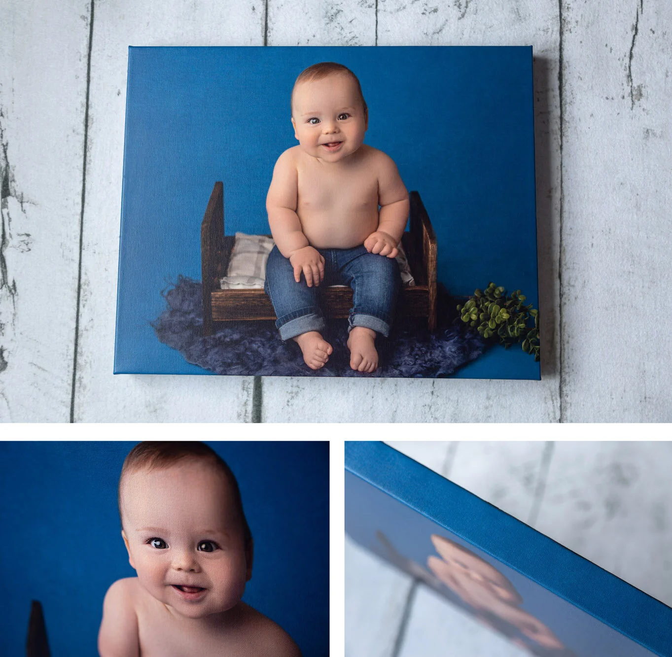 Most clients are familiar with this canvas style. Ready to hang, it is a great option. Your portrait prints directly onto a polly cotton blend canvas and then stretches around a solid wood frame coated with a UV coating that provides 100 years of archival quality.